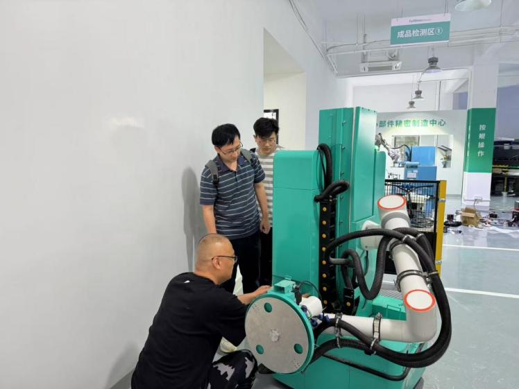 在企业负责人张可的陪同下,先后参观了产品技术展示区与生产车间。技术人员现场演示了机器人在不同施工场景下的智能化作业流程,其精准的操作、高效的施工效率,充分展现了智能建造技术的革新成果。在生产车间,两位教师深入了解了机器人从零部件加工到整机组装调试的全过程,近距离感受企业严格的质量管控体系。